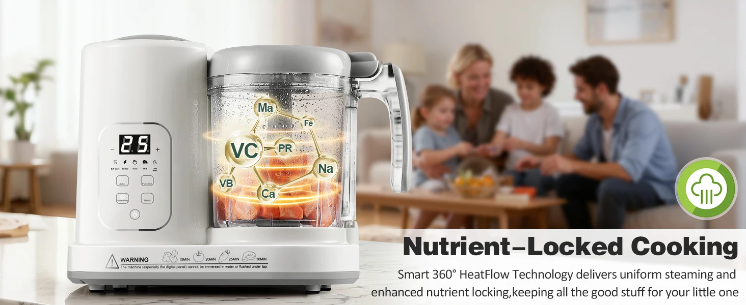 Steam, blend, sterilize, and reheat in one appliance – saves 50% prep time vs. traditional methods